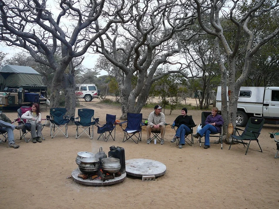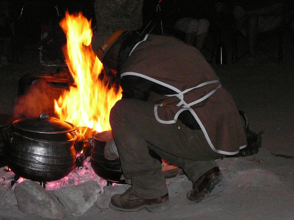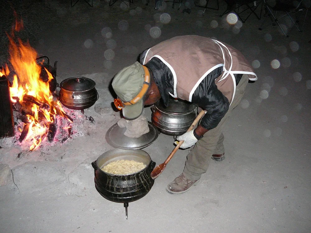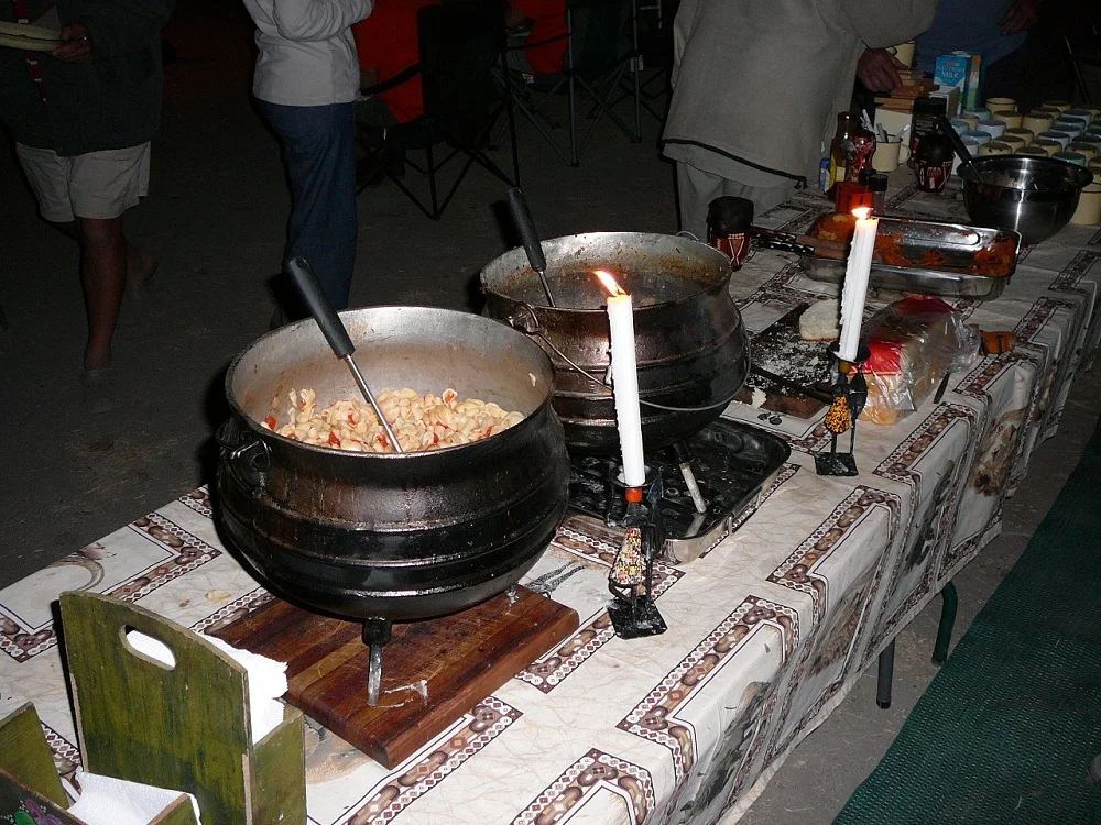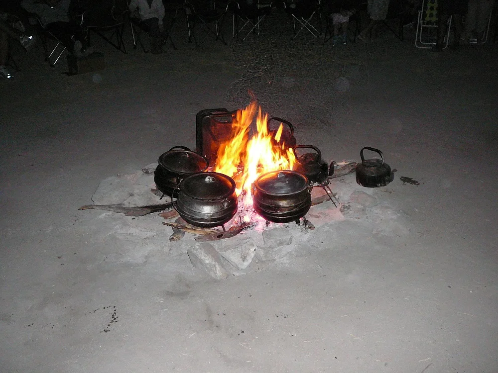 A huge fire was already burning, heating water for tea or coffee and for the dishes after dinner. Our dinner was bubbling away in huge cast iron pots. Shortie, a legend in the South African 4x4 touring fraternity was our chef. He prepared what seemed like food for Africa and certainly lived up to his reputation – the food was delicious.