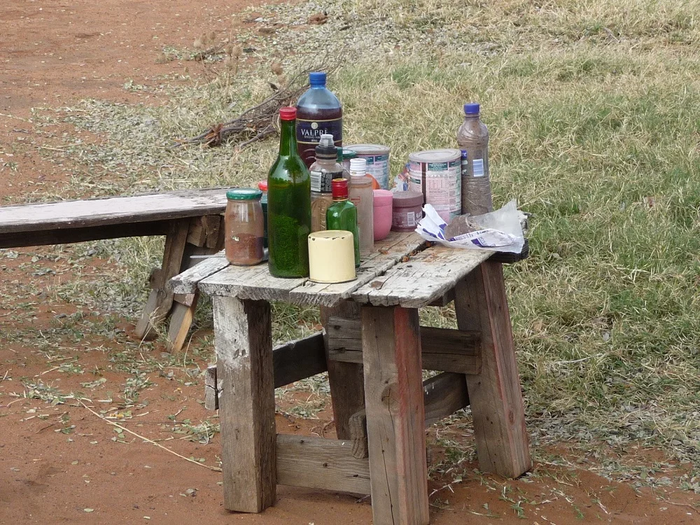 A short distance outside the rhino sanctuary, on the side of the road was a small village where we stopped before heading to Letlhakane. A rudimentary wooden table was filled with a collection of Vaseline (petroleum jelly) jars, baby milk powder tins, and liquor bottles. In these containers was an array of ‘Muti’ (traditional medicine).