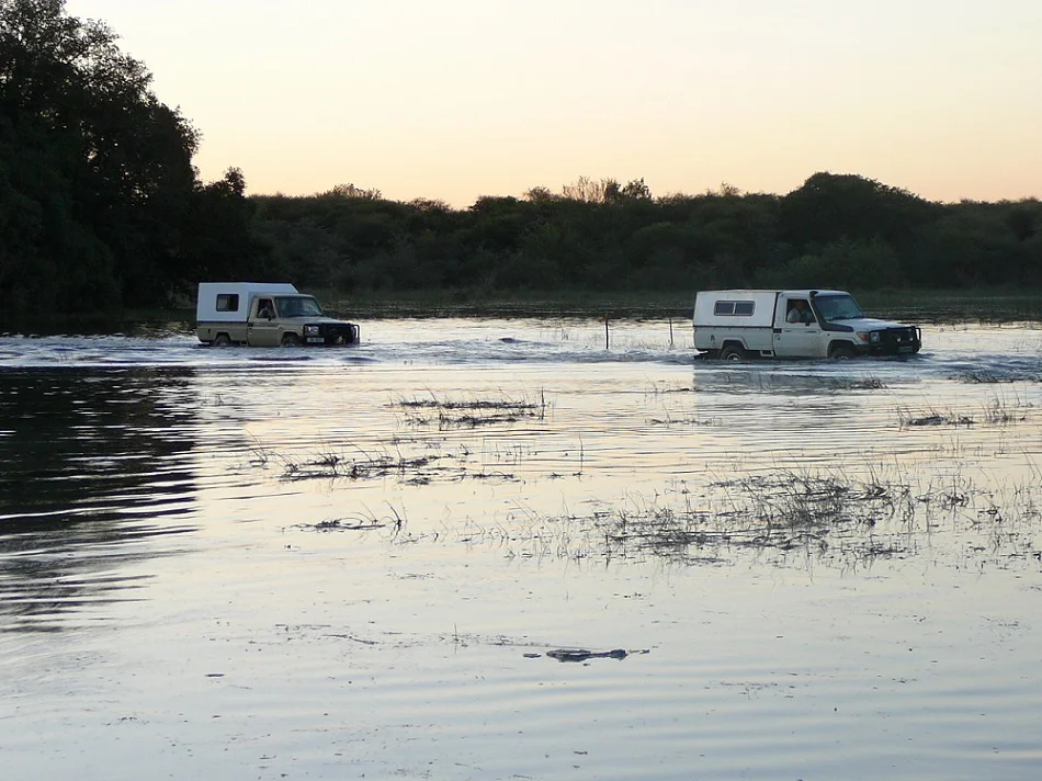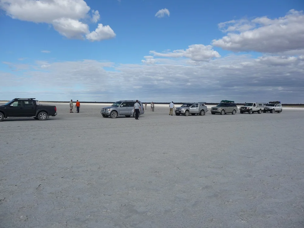 Traveling in convoy overland on safari, exploring salt pans and navigating wetlands.