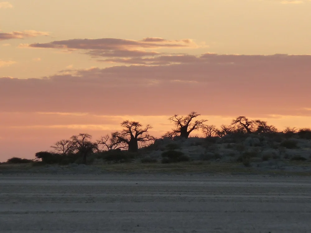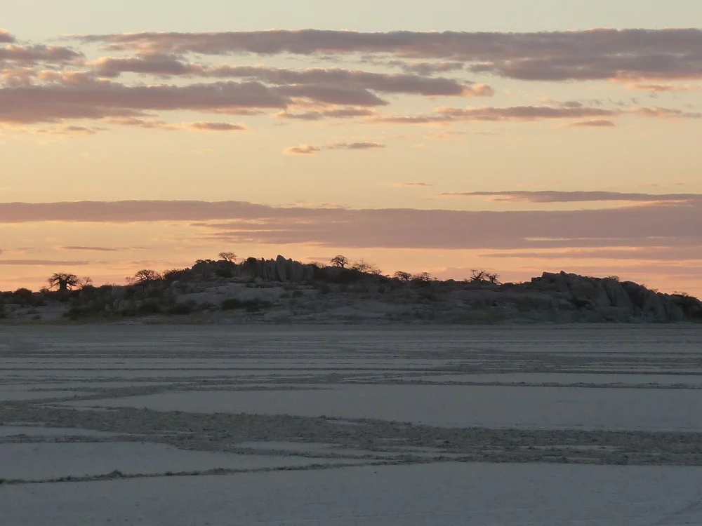 We took out our camping chairs, sipped our sundowners while watching a spectacular sunset behind the baobabs. We had a full 360-degree view including Kubu island. A massive salt pan.