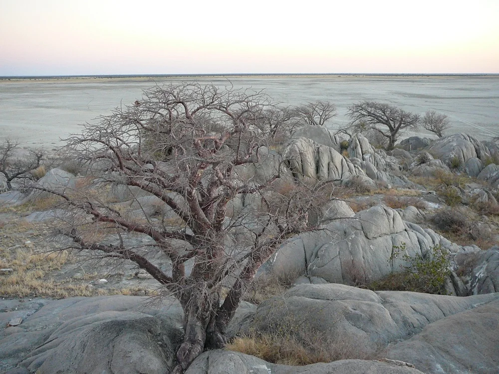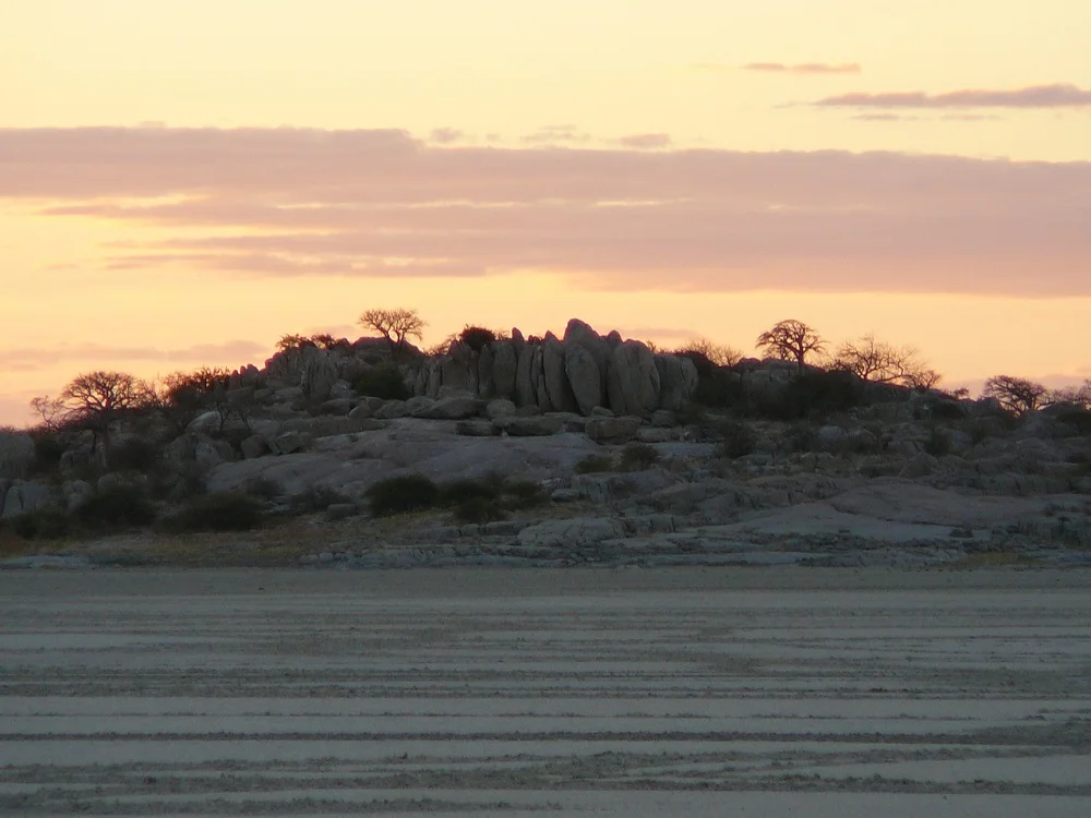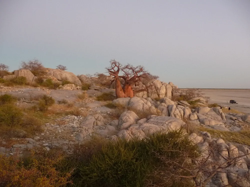 We stayed on the track that weaved its way through sand and grass. An insignificant mound appeared on the horizon. That was what we were heading for. A granite island with giant baobabs rising between the rocks. We’d reached Lekhubu Island, often called Kubu, a sanctuary on the flat salty landscape.