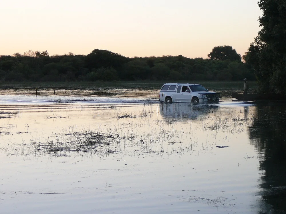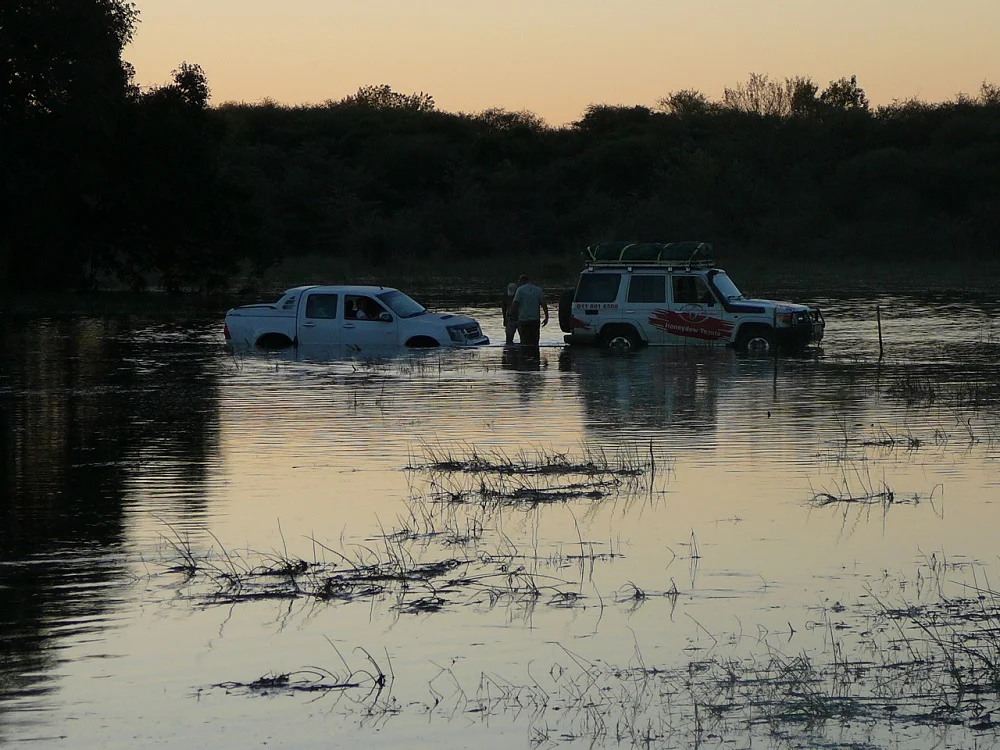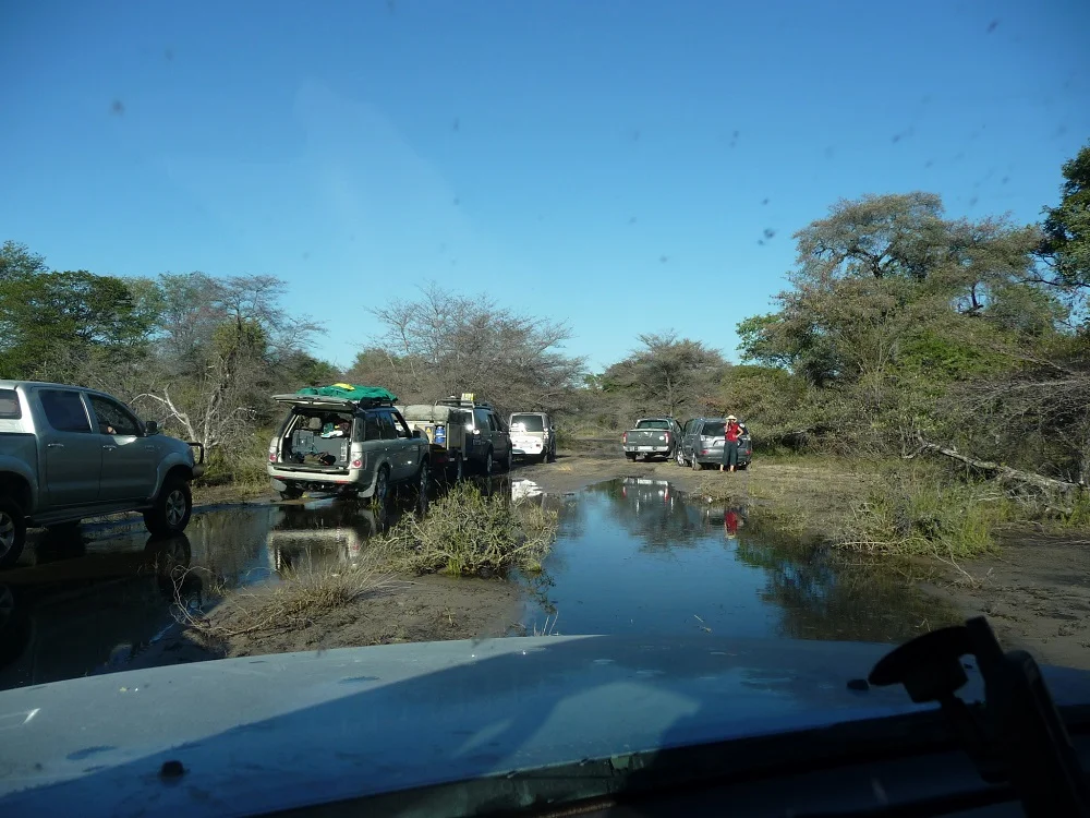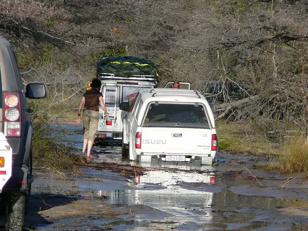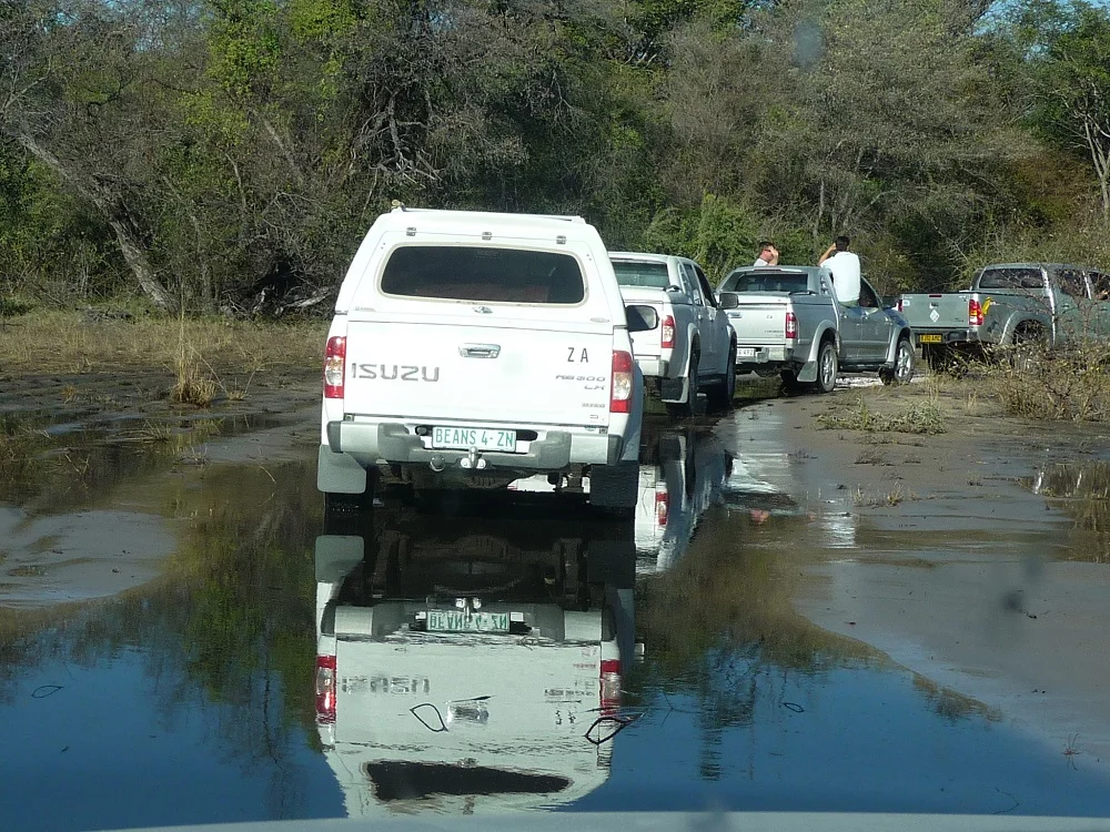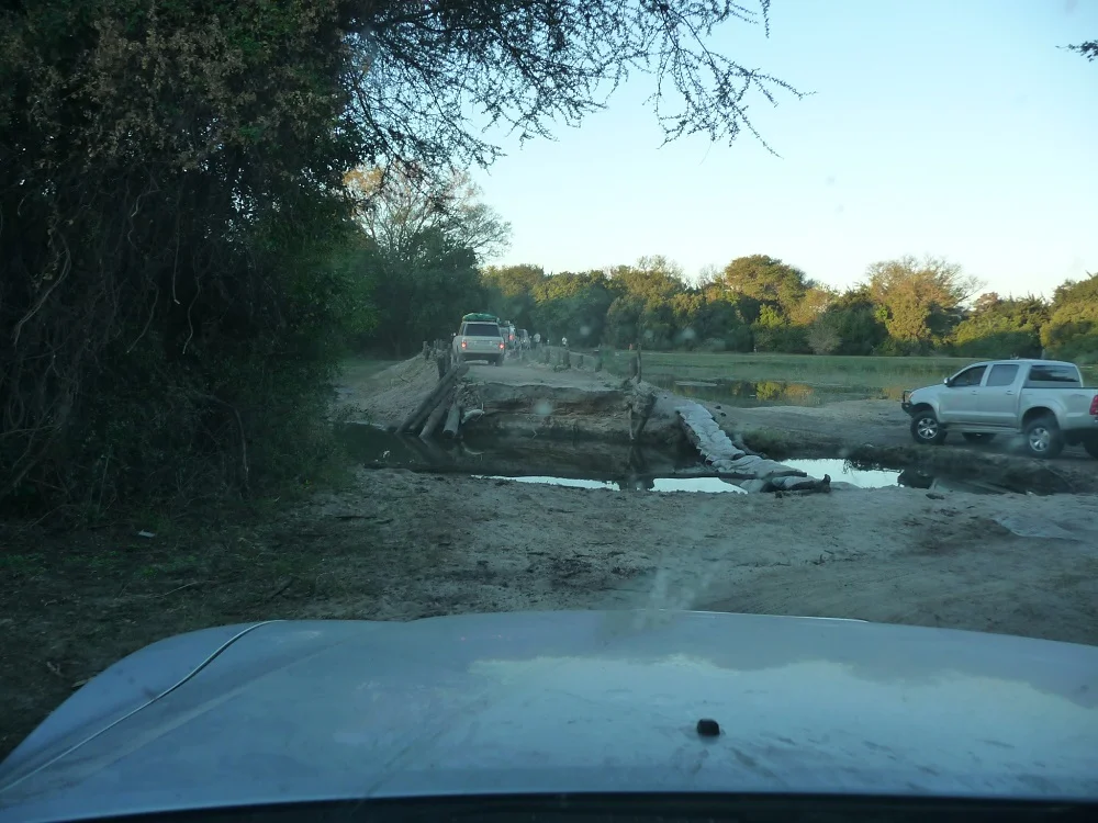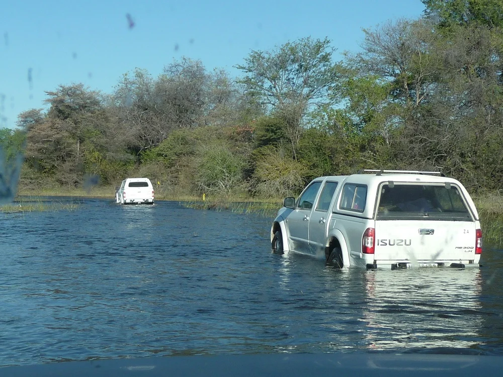 Our convoy treaded water, slowly, very slowly, because we were twenty vehicles. Eventually we reached the final section just ahead of our camp. We couldn’t rest on our laurels yet, because were faced with another obstacle. Between us and our camp at Nguma Island Lodge was an even bigger section of water. Our camp was on the other side of that water. There was a bridge; take note, was. Because of the floods, part of it had washed away. This was a bigger challenge as the water was deeper.